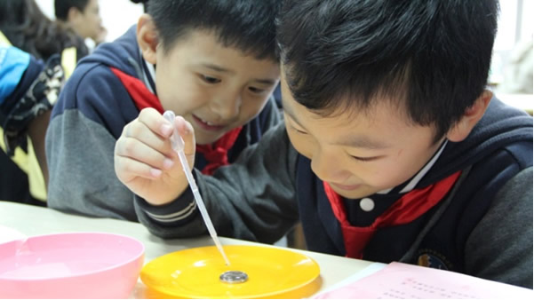 开场前内容丰富的科学启蒙小游戏,引发了学生与家长的参与热情。浮的曲别针、听声辨物、超越颠峰……,平凡中的神奇,让学生们兴致昂然。